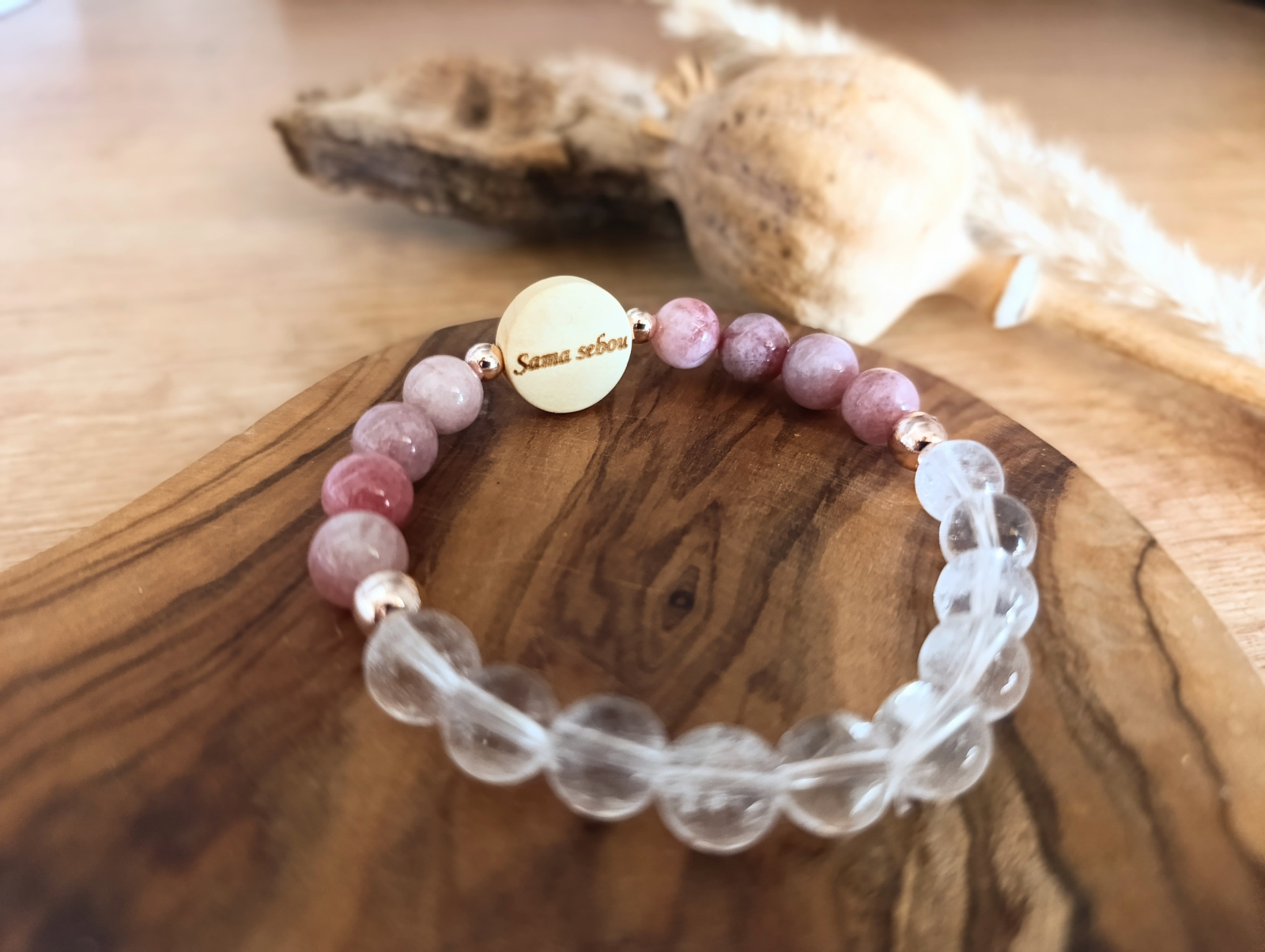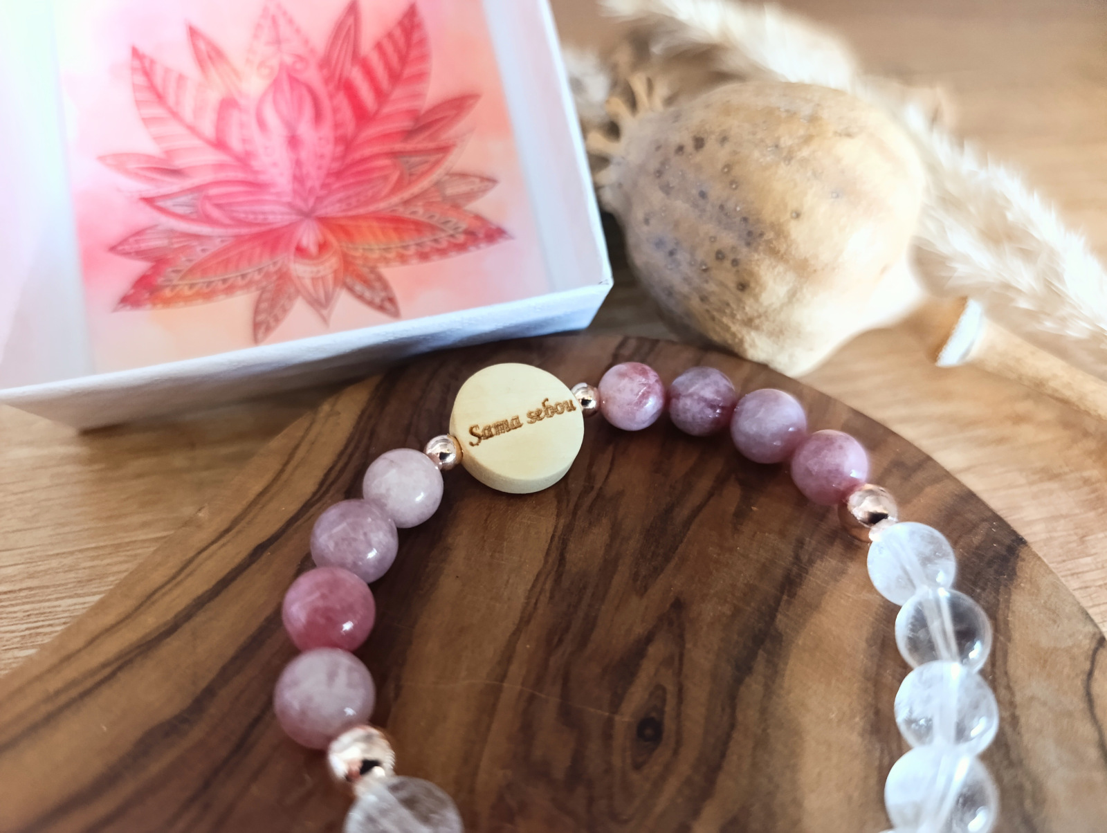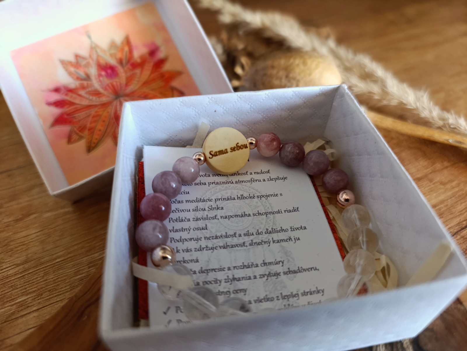 Materiál: Krištáľ (8 mm), Slnečný kameň (8 mm), Hematit (6 a 4 mm), drevený doplnok s vygravírovaným textom