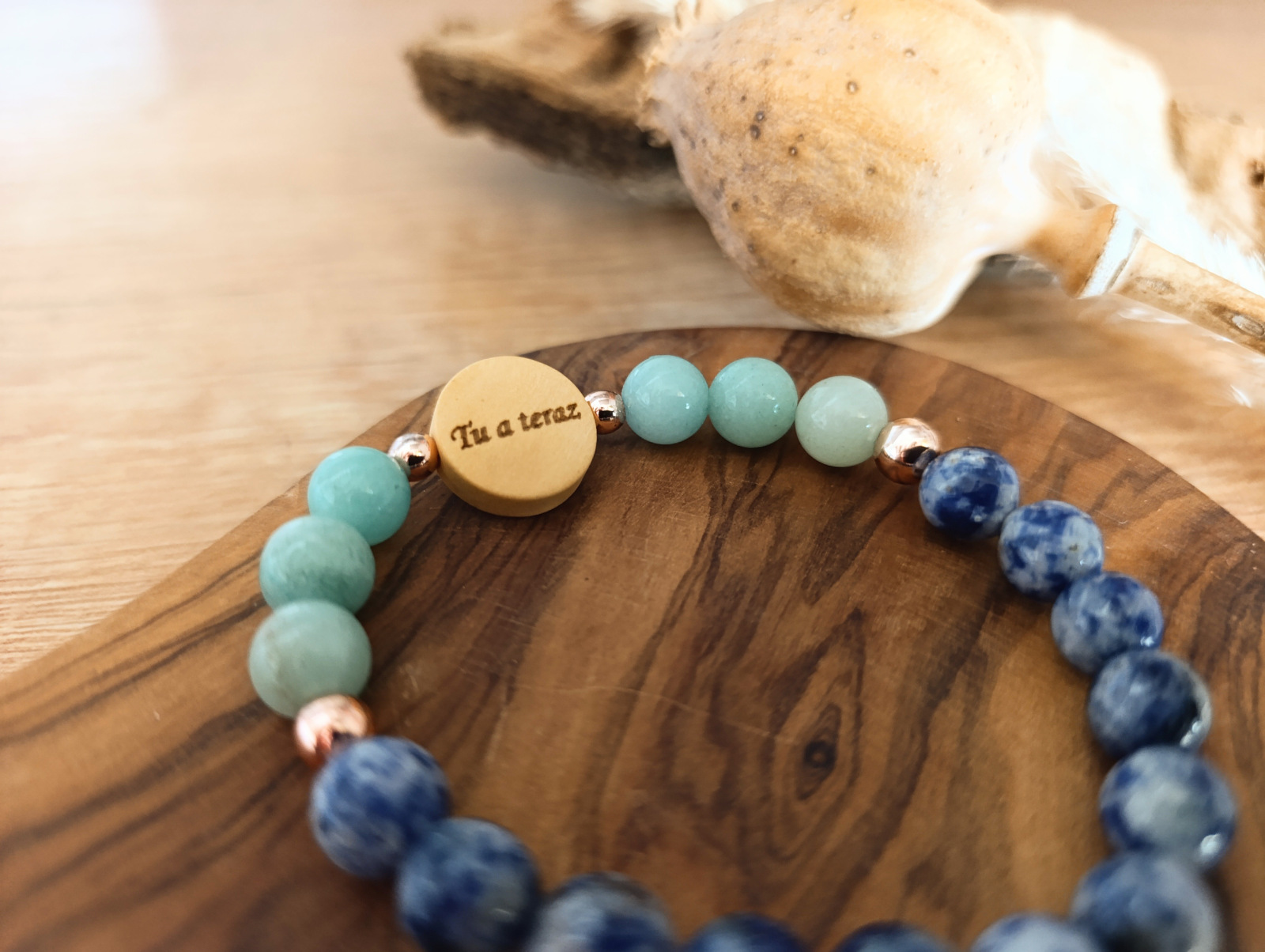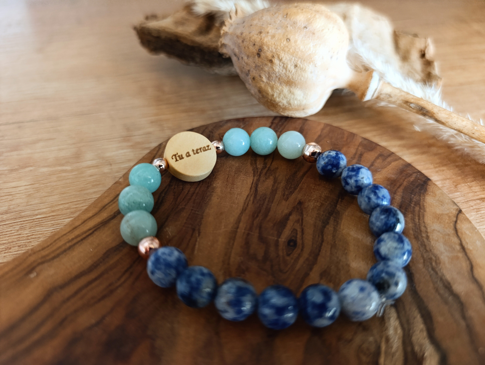Materiál: Sodalit (8 mm), Amazonit (8 mm), Hematit (6 a 4 mm), drevený doplnok