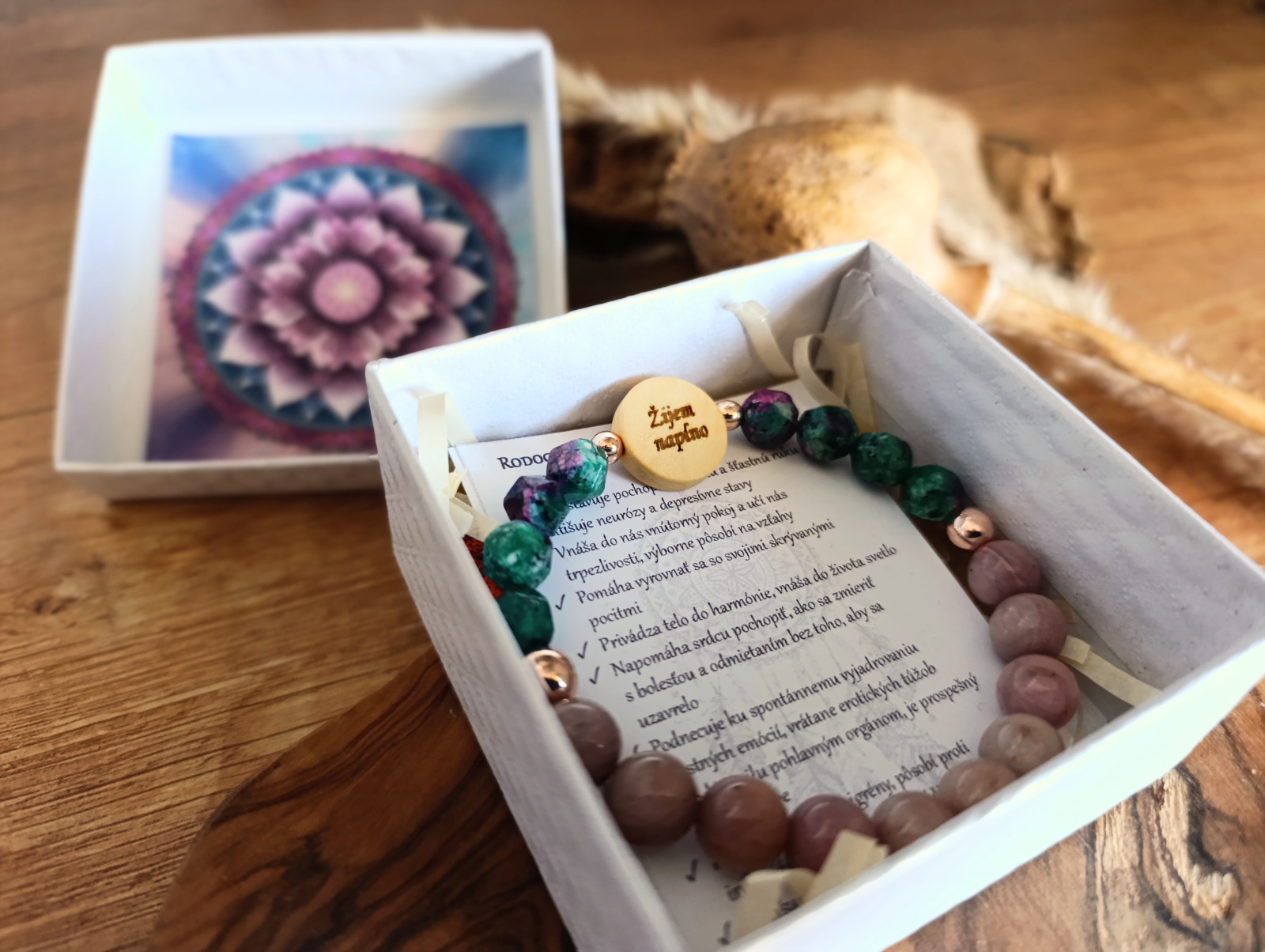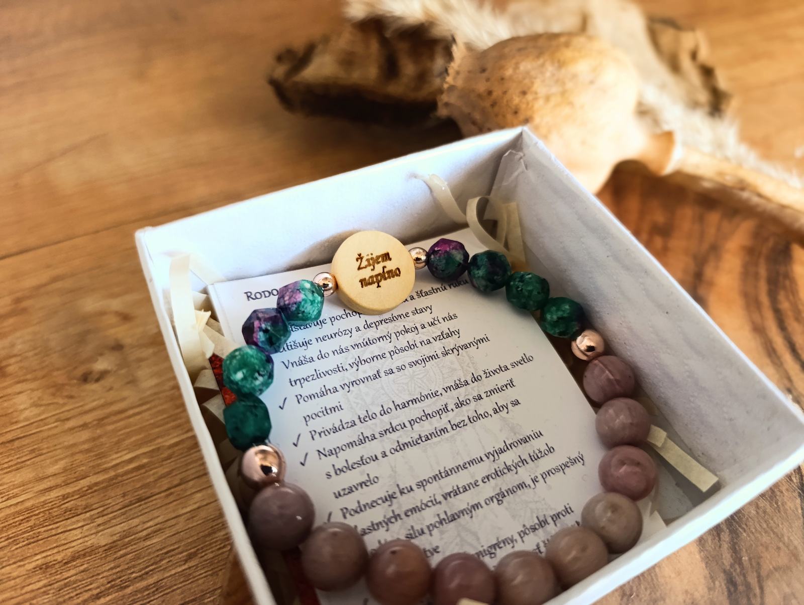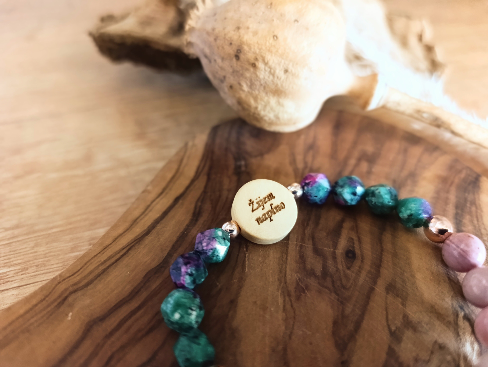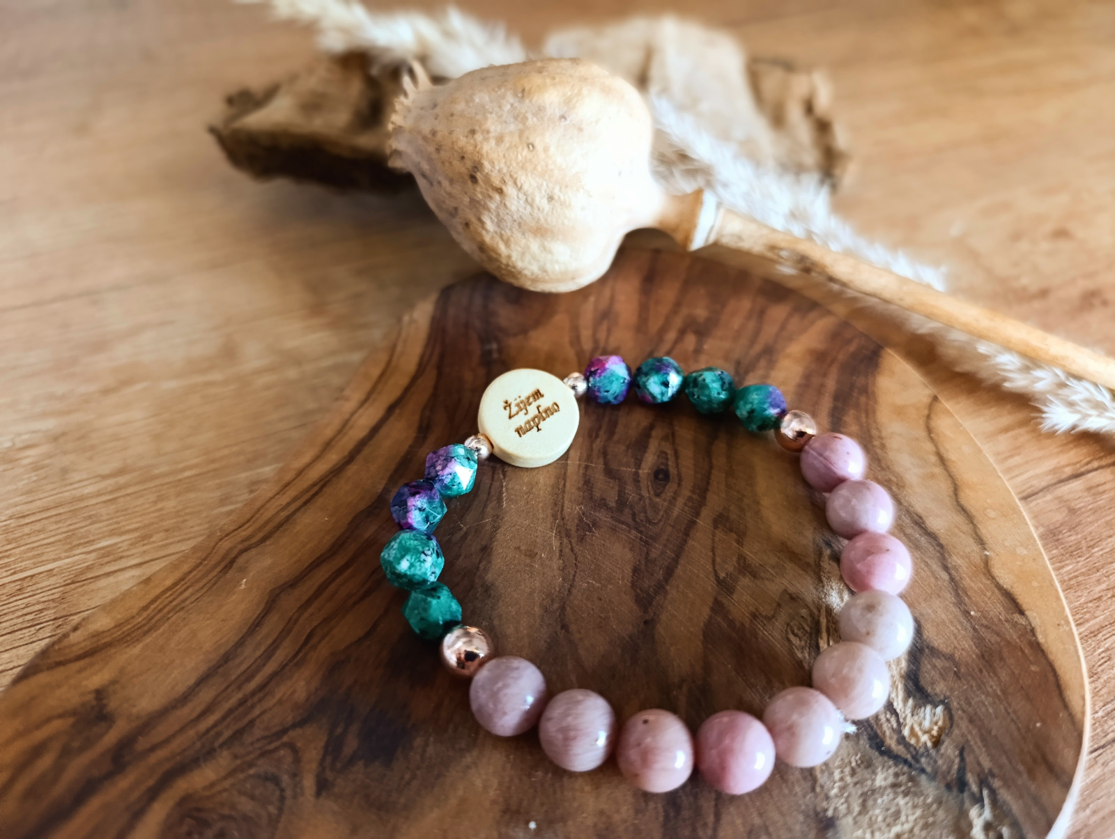 Materiál: Rubín v Zoisite (8 mm), Rodochrozit (8 mm), Hematit (6 a 4 mm), drevený doplnok