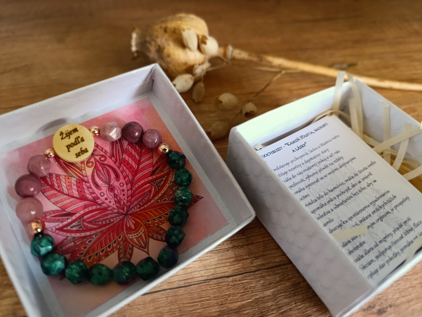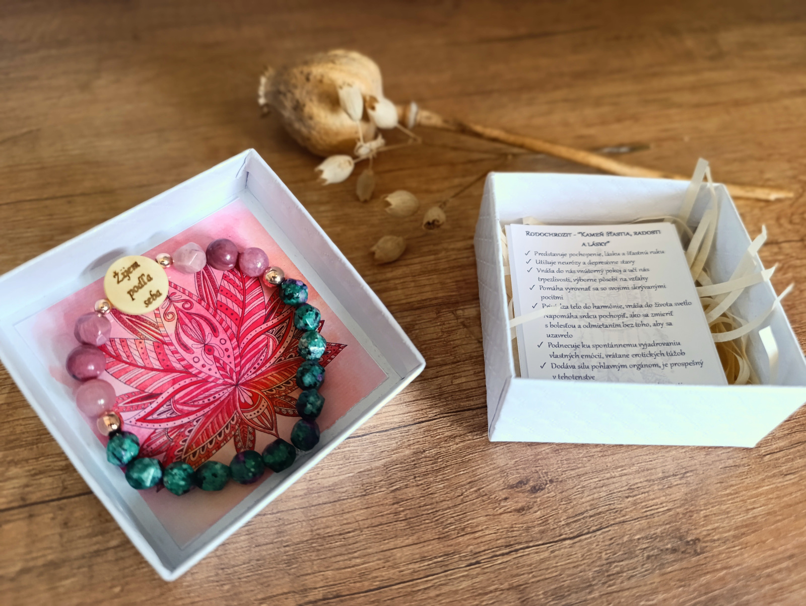 Materiál: Rubín v Zoisite (8 mm), Rodochrozit (8 mm), Slnečný kameň (8 mm), Hematit (6 a 4 mm), drevený doplnok s vygravírovaným textom “Žijem podľa seba”