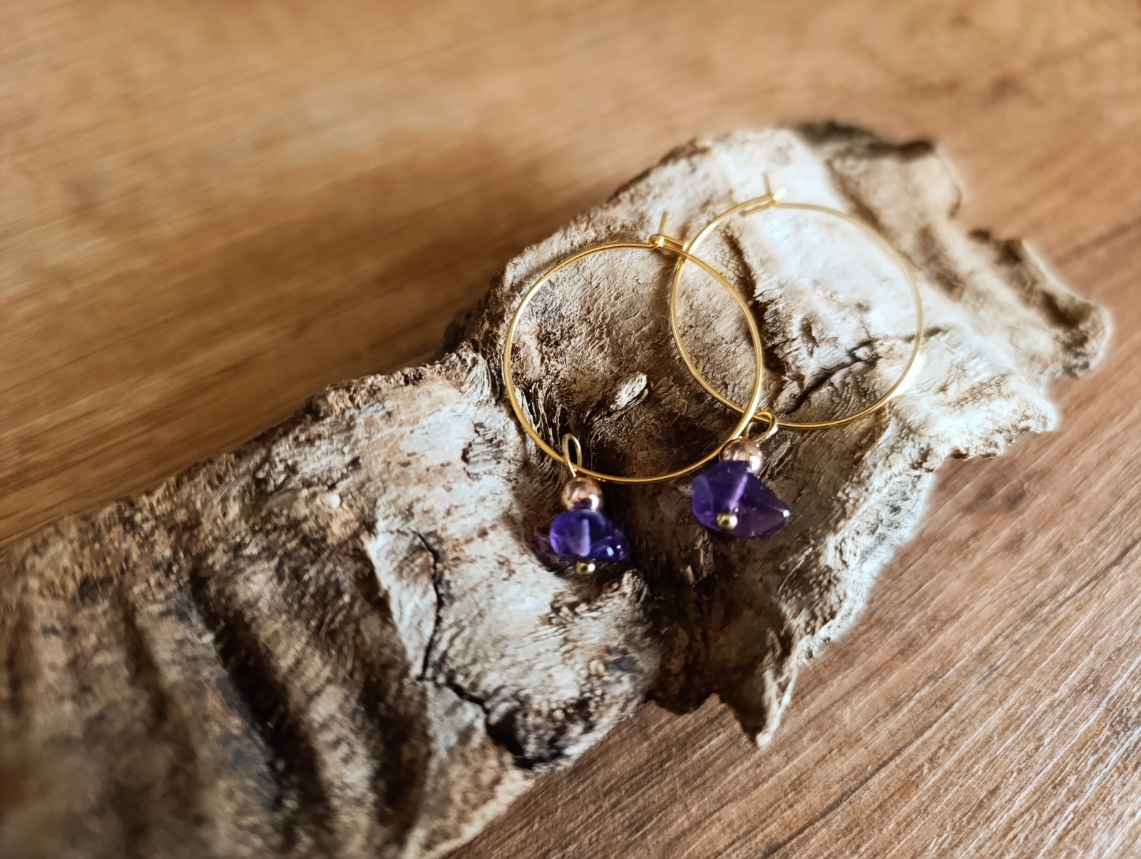 Náušničky z Ametystu v zlatom farebnom prevedení. Kreole sú z nehrdzavejúcej ocele, takže znesú aj citlivé ušká.