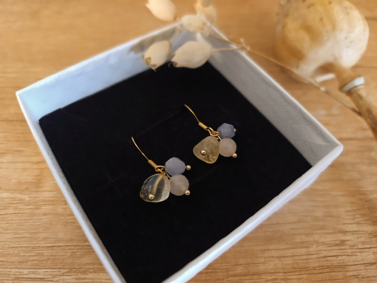 Náušničky z minerálov, v zlatom farebnom prevedení. Afroháčiky sú z nehrdzavejúcej ocele.