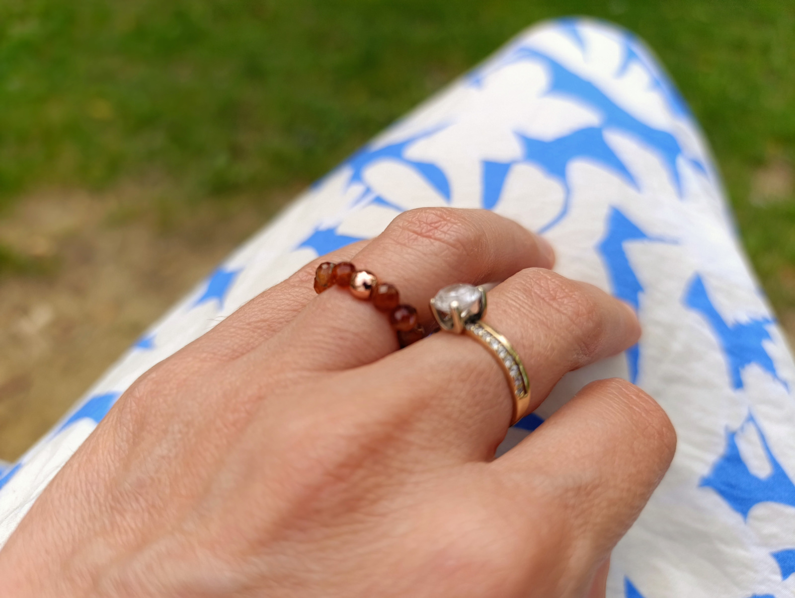 Energetický minerálny prsteň z prírodných kameňov, navlečených na pružnom silikónovom lanku.