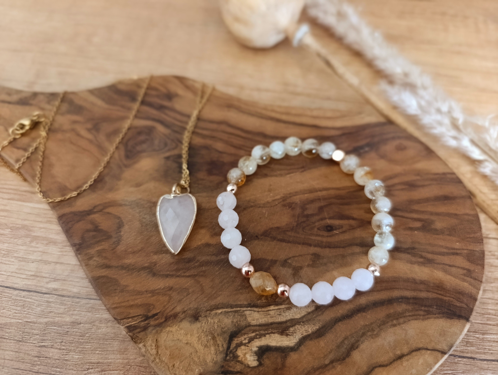Materiál: Ruženín (6 mm), Citrín (6 mm), Hematit povrchovo nafarbený ružovo-zlatý (4 mm), Ruženínové srdiečko (cca 2 cm), retiazka z nehrdzavejúcej ocele dĺžky 45(+5) cm